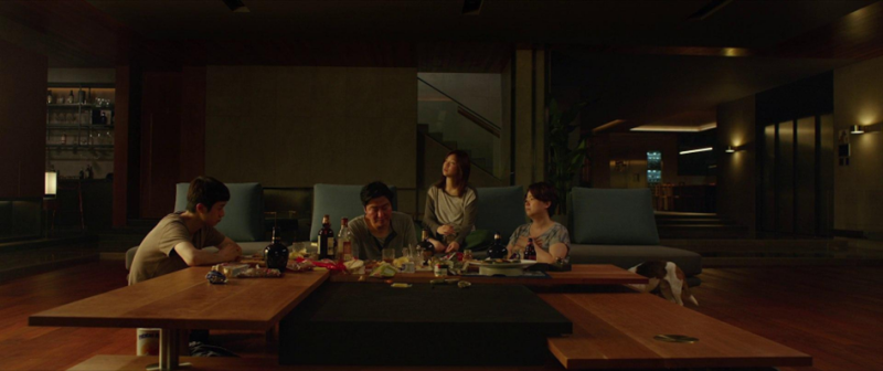 Le ton devient tout de suite plus lourd lorsque les Kim, déjà bien installées dans leur rôle d’infiltration, se mettent à profiter de la maison de la famille Park en leur absence (voir l'image ci-dessus). Une scène excellente pour son aspect social (on reviendra là-dessus), mais surtout car elle sert de transition pour l’intrigue, passant de la comédie au drame. Cela s’opère par un procédé scénaristique classique mais très efficace : la technique de l’élastique, qui consiste à étirer le temps avant un évènement important de l’intrigue, afin de créer de la tension. Ici, on sait pertinemment que profiter de la villa de cette façon va causer du tort à la famille. Et pourtant, c’est exactement ce qu’on attend. Le passage à une atmosphère dramatique s’opère lorsque la famille perd le contrôle de sa tromperie, après le retour inopiné de la gouvernante.