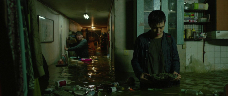 Cette critique acerbe de la reproduction sociale est visible durant l’entièreté du film, ne serait-ce qu’avec ces deux familles très différentes dont les enfants semblent suivre le même chemin que leurs parents. On remarque cette différence avec l’inondation (voir l'image ci-dessus), symbole de problèmes très pénalisants qui touchent les pauvres mais dont les riches sont épargnés, et par les ignorants. Et même si les Park semblent créer un semblant d’affection avec leurs employés, celle-ci n’est que professionnelle et factice - ce que l’on remarque avec l’aisance qu’ils ont à les remplacer, ou plus clairement avec la discussion qu’ont les deux parents sur leur canapé. On voit dans cette scène un fort mépris, surtout vis-à-vis de l’odeur, mais aussi une envie de maintien des inégalités de richesse - les employés ne devant pas franchir une certaine limite selon le père (« J’aime les gens qui savent rester à leur place »). C’est justement ce mépris qui va pousser Ki-taek à tuer ce dernier, comme un coup porté à l’oppresseur par l’oppressé, poussé à bout.